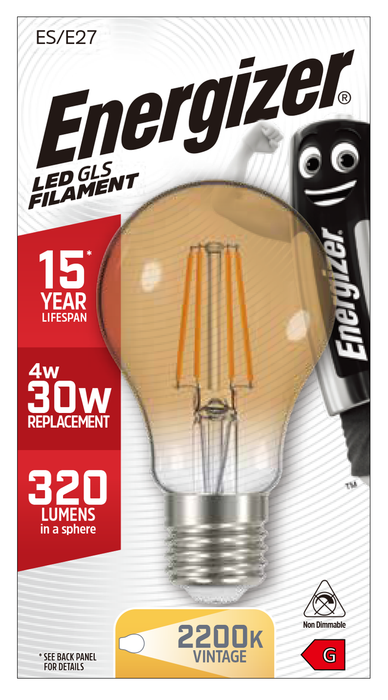 Energizer 4W 320lm E27 ES GLS Filament Gold LED Bulb Warm White 2200K