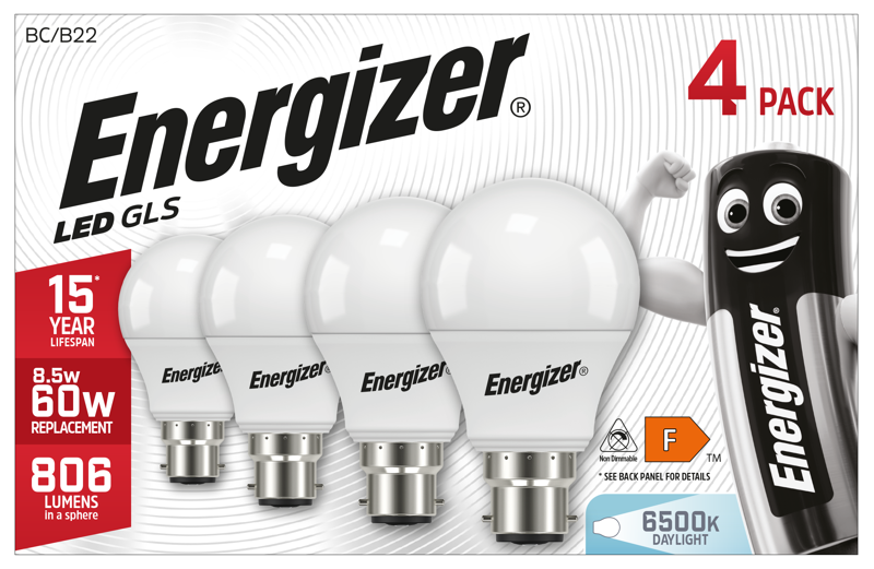 Energizer S14062 8.5W 806lm B22 BC GLS LED Bulb Opal Daylight 6500K (4 Pack)