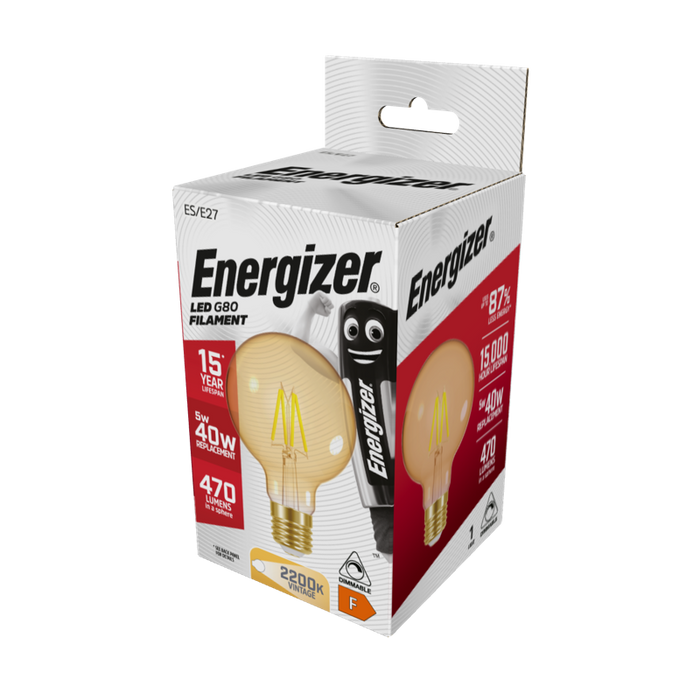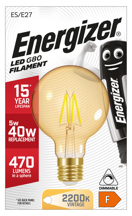 Energizer 5W 470lm E27 ES G80 Filament Gold LED Bulb Warm White 2200K Dimmable