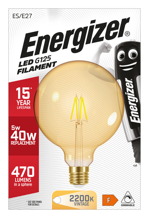 Energizer 5W 470lm E27 ES G125 Filament Gold LED Bulb Warm White 2200K Dimmable