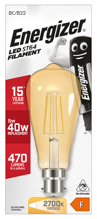 Energizer S9432 5W 470lm B22 BC ST64 Filament Gold LED Bulb Warm White 2700K