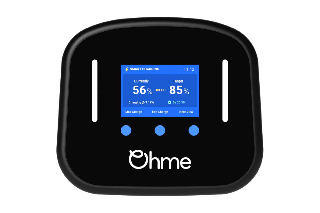 Ohme’s latest home EV charger, featuring an interactive LCD screen, displays live charge data and gives drivers the option to control their charging from the charger itself.