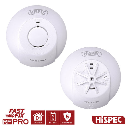 HiSPEC MAINS Power RADIO FREQUENCY 1x Smoke & 1x Heat Detector RF10-PRO with 10Yr Rechargeable Lithium Battery Backup
