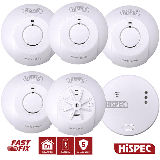 HiSPEC MAINS Power INTERCONNECTABLE 5x Smoke & 1x Heat Detector FF10 with 10Yr Rechargeable Lithium Battery Backup