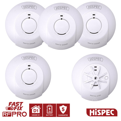HiSPEC MAINS Power RADIO FREQUENCY 4x Smoke & 1x Heat Detector RF10-PRO with 10Yr Rechargeable Lithium Battery Backup