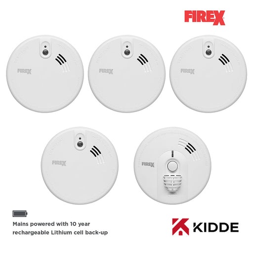 Kidde Firex 5x KF20R Optical Smoke & 1x KF30R Heat Alarm Kit Mains Powered with Sealed-In Rechargeable Battery Back-Up