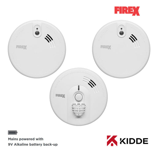 Kidde Firex 2x KF20 Optical Smoke & 1x KF30 Heat Alarm Kit Mains Powered with 9V Alkaline Battery Back-Up