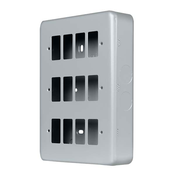 A robust new range of durable, stylish wiring accessories built to withstand the demands of everyday use. Designed with a sleek, curved profile with matching back box profile, Metal Clad Pro combines modern aesthetic with our latest innovations for secure, long-lasting performance in any environment.This item is Metal Clad Pro 12 Gang GridPro Front Plate