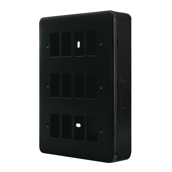 A robust new range of durable, stylish wiring accessories built to withstand the demands of everyday use. Designed with a sleek, curved profile with matching back box profile, Metal Clad Pro combines modern aesthetic with our latest innovations for secure, long-lasting performance in any environment.This item is Metal Clad Pro 12 Gang Gridpro Front Plate - Black