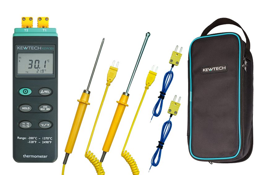 The kit includes the two channel KEW301 thermometer with surface and liquid probes all kept together in a strong kit bag which is divided to store the instrument away from the probes.