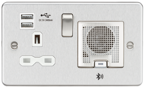 Knightsbridge FPR9905BCW Flat Plate 13A Socket + USB 2.4A + BT Speaker - Brushed Chrome + White Insert