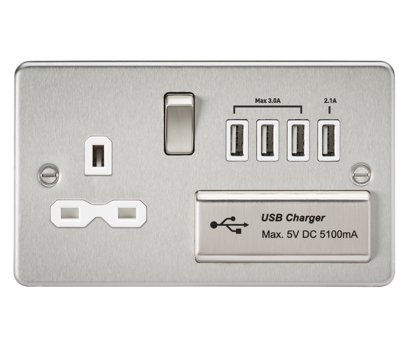 Knightsbridge FPR7USB4BCW Flat Plate 13A Switched Socket + Quad USB – Brushed Chrome + White Insert