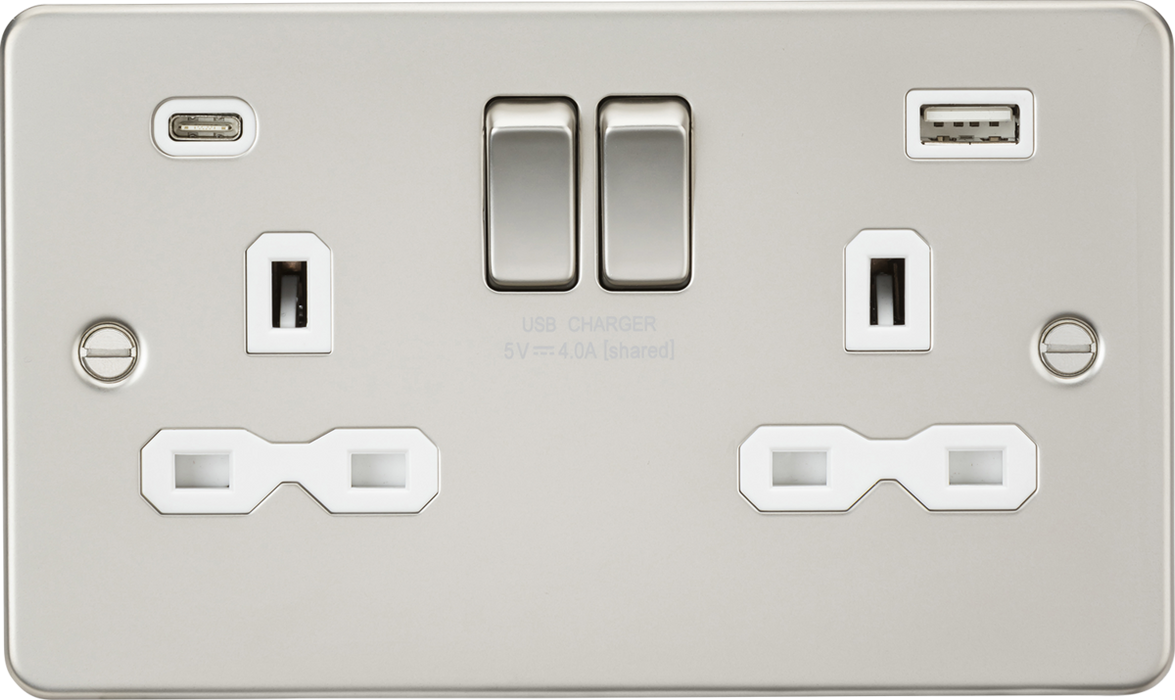Knightsbridge FPR9940PLW Flat Plate 13A 2G SP Switched Socket + 2xUSB A+C (5V DC 4.0A Shared) - Pearl + White Insert