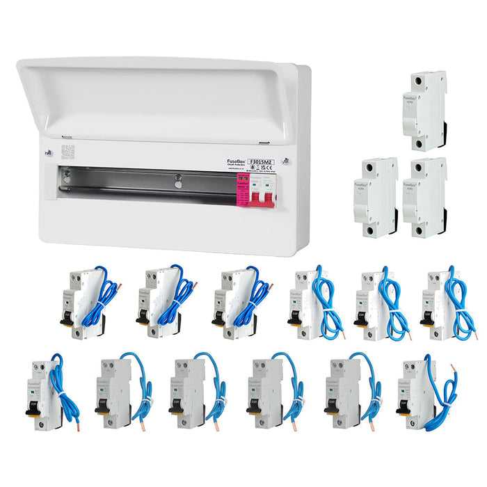FuseBox F3015MZ 15 Way T2 SPD Consumer Unit + 12 Type A Bi-Directional Mini RCBOs & 3x FREE DIN Rail Blanks