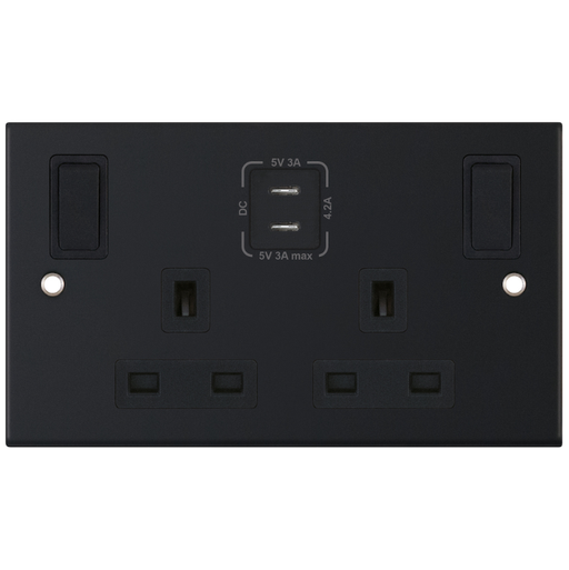 Selectric DSL11-61 5M 2 Gang 13A Switched Socket Outlet with 2x USB Type-A (2.1A/1A) - Matt Black, Black Insert