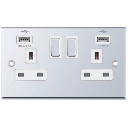 Selectric 7MPRO-361 7M-PRO 2 Gang 13A Switched Socket Outlet with 2x USB Type-A (2.1A/1A) - Polished Chrome, White Insert
