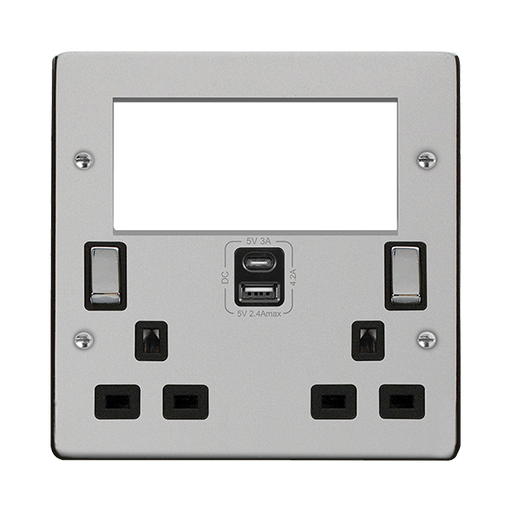 Click Deco Plus DPCH684BK 2 Gang 3 Pin Safety Shutter Type A & C USB Switched Socket with Quad New Media Apertures - Polished Chrome (Black)
