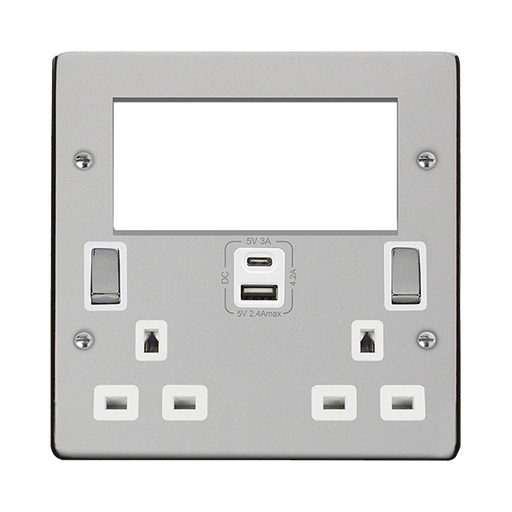 Click Deco Plus DPCH684WH 2 Gang 3 Pin Safety Shutter Type A & C USB Switched Socket with Quad New Media Apertures - Polished Chrome (White)