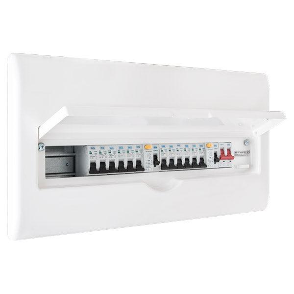 BG CFFDP18608ASPD 16 Module 8 Way Fully Recessed Populated + 100A Switch, 1x80A, 1x63A Type A 30mA RCD, 1xSPD & 8xMCBs