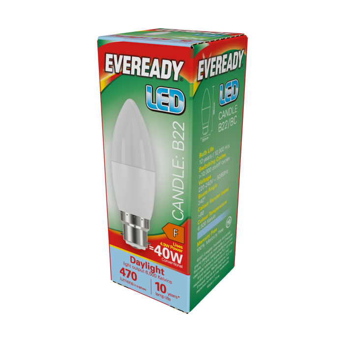 Eveready S13611 B22 BC Candle LED Bulb Opal 4.9W 470lm Daylight 6500K (5 Pack)