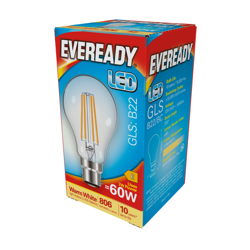 View full detailsEveready S15485 B22 BC GLS Filament Clear LED Bulb 7W 806lm Warm White 2700K
