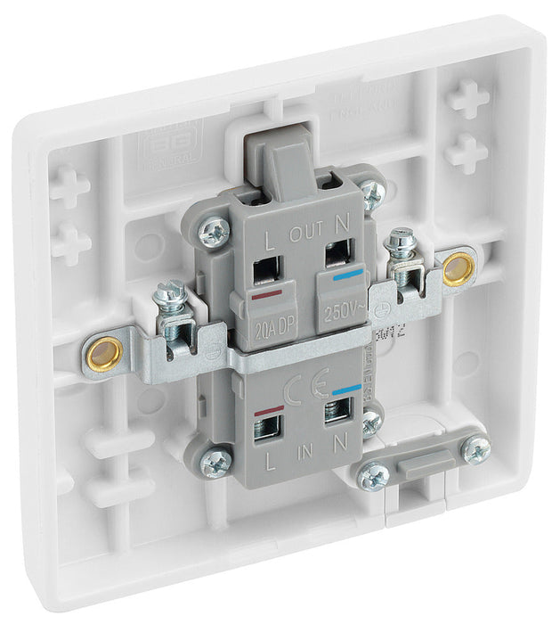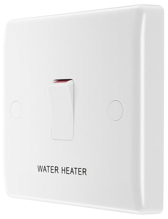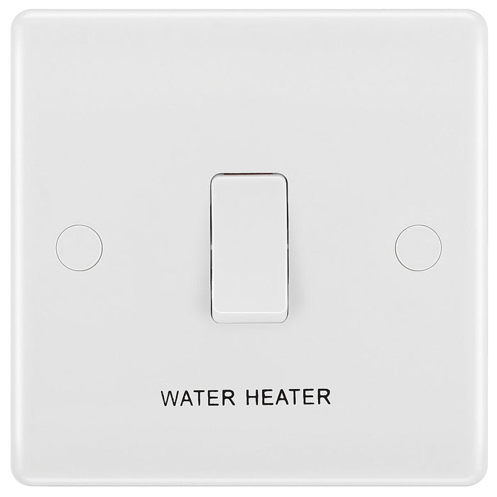 BG White Round Edge 20A DP Switch marked Water Heater + Cable Outlet