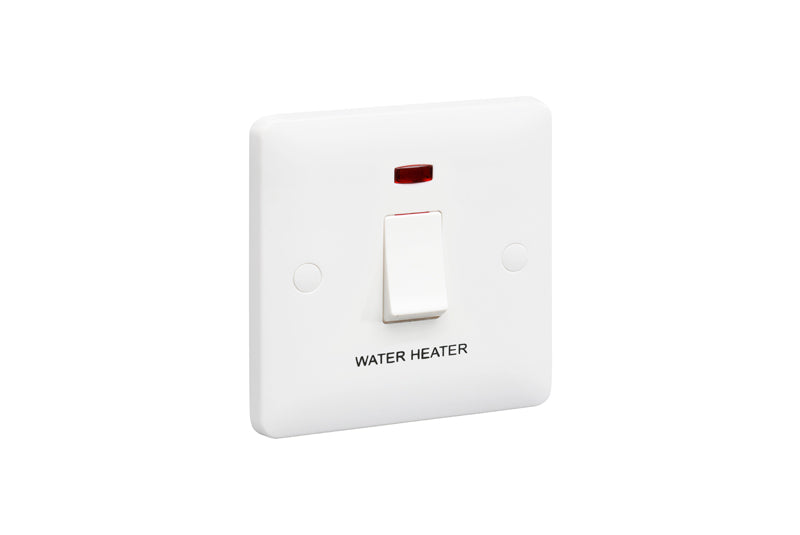 MK Base MB8423WHWHI White Moulded 20AX 1G DP Switch + Neon marked Water Heater