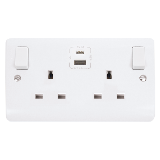BG 822UAC45 White Round Edge 13A Double Switched Power Socket + USB A+C (45W) WHITE MOULDED wiring accessories available in a range of Round Edge f...