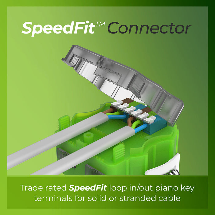 - Trade rated toolless SpeedFit connector - loop in/out piano key terminals for solid or stranded cable.