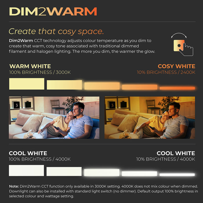 - Benefit from better lighting to create that cosy space. Adjusts colour temperature as you dim to create that warm tone associated with traditional dimmed filament and halogen lighting. The more you dim, the warmer the glow. Note: FType can also be installed with standard light switch. Default 100% brightness in selected colour and wattage setting.