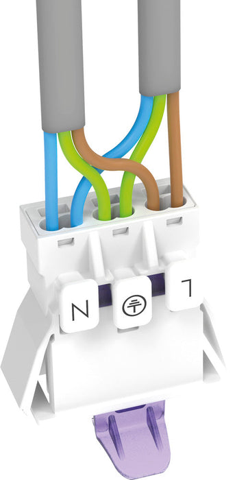 • Removable VDE certified push-fit terminal block improves wire access – ideal with stiff cable. 18th edition 500V insulation resistance testing compatible.
