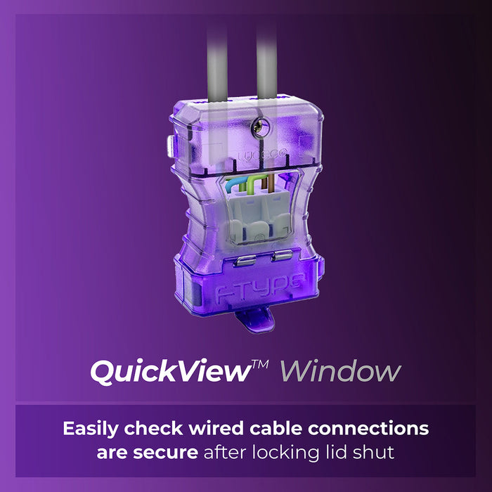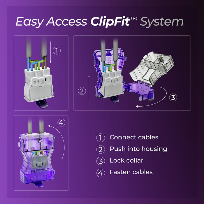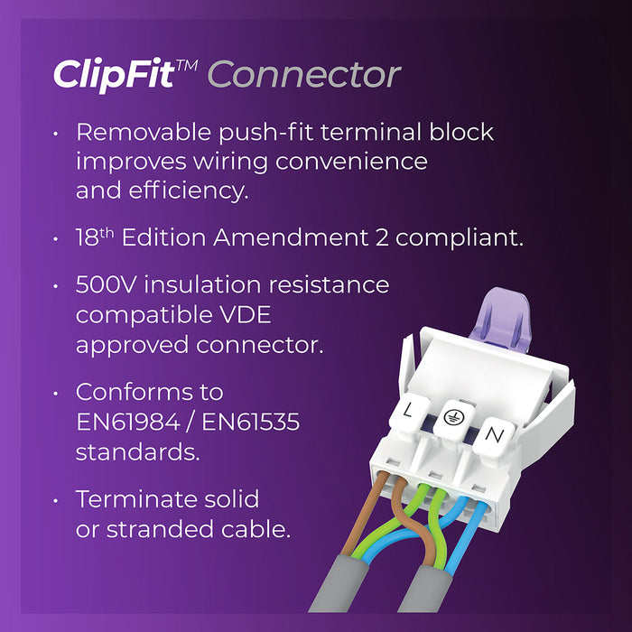 • Patent pending tooless Easy Access ClipFit connector with true 1st/2nd Fix installation. QuickView Cable Window - check wire connections after locking lid shut. UK Patent Pending No. 2305019.8.